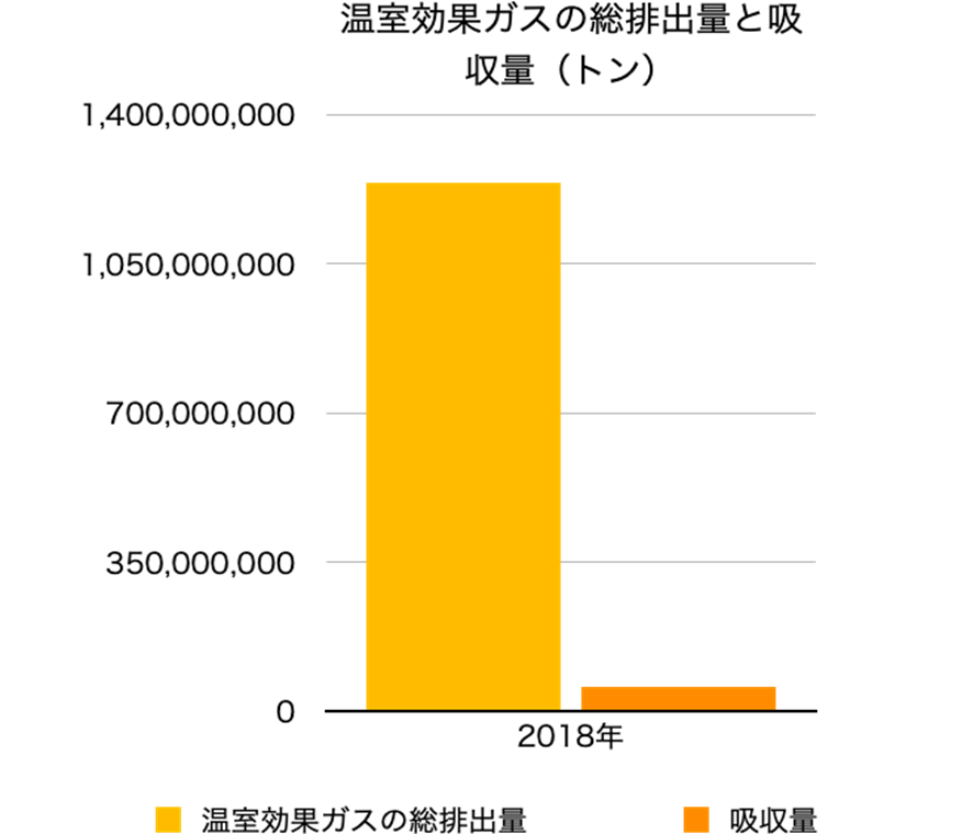 2018年の統計では、二酸化炭素を含む温室効果ガスの総排出量は「12億4,000万トン」だったのに対し吸収量は「5,590万トン」でした。但し、排出量と吸収量を統計した団体が別のため、この数値には多少の誤差があると考えられます。