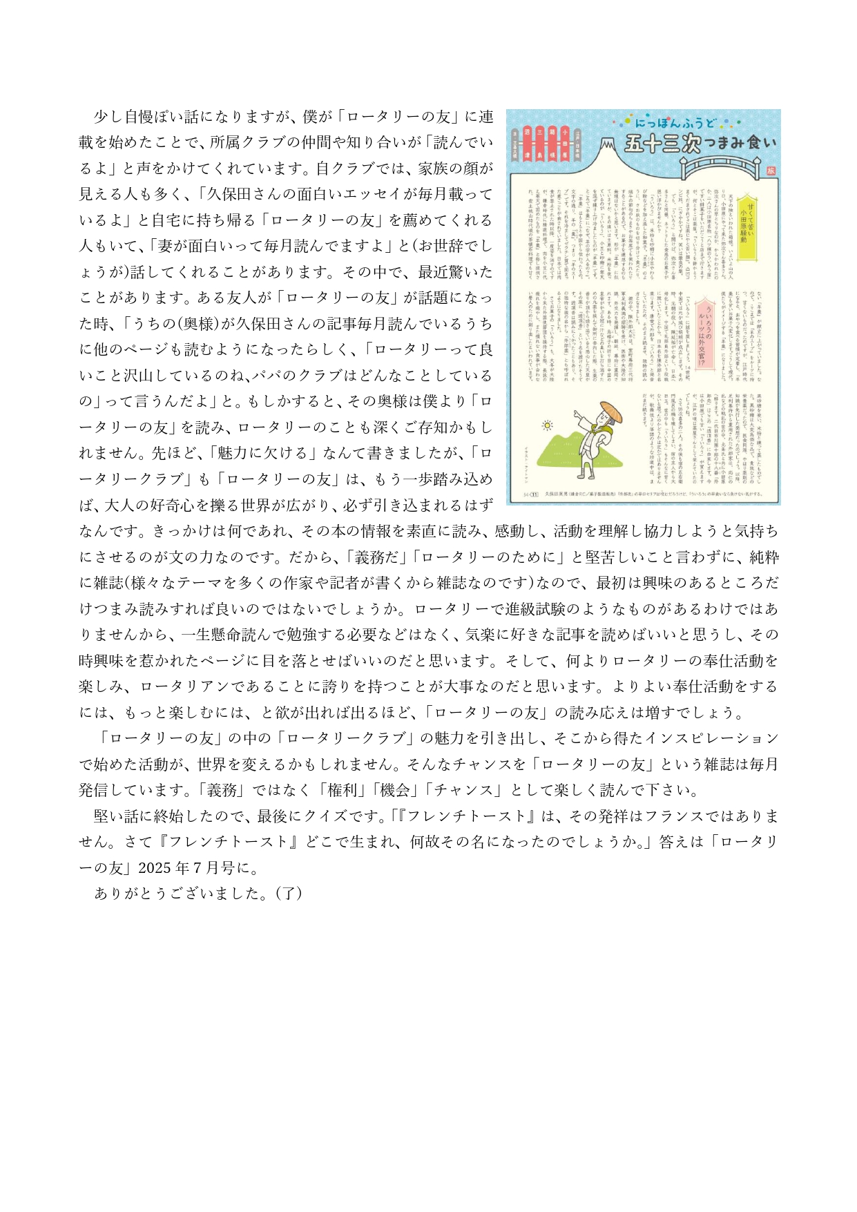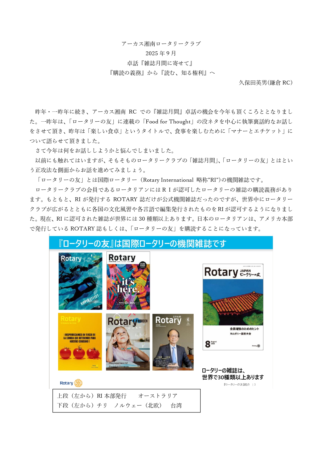 鎌倉RCの久保田英男PGが『ロータリーの友』での連載を始められて以来、当クラブでは「ロータリーの友」月間に合わせて卓話をお願いするのが恒例となっております。