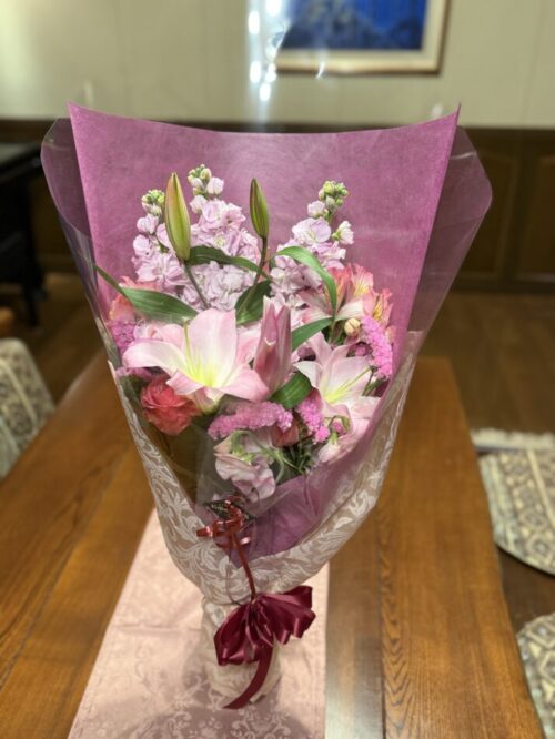 その最たる理由は、人前で喋ることが大の苦手であるということ。例会がオンライン上での開催で、挨拶は原稿を書いて掲載するスタイルをとっていたため、私にとってこれは大変にありがたかったのです。それに、文章に感情の起伏は現れるにしても、書きながら涙を流すことはあってもその姿を見られることはありませんので良かったのですが、それなのに、最後の出席となった第三グループの会長幹事会の懇親会の席で終盤、どこからとなく花束が二つ見え、「どこか別のグループでこのようなところでお祝いするところがあるのね・・・」なんて思っていたら、花束を持っている方たちは見覚えのある方たち、そしてこちらに向かっていらっしゃって…。